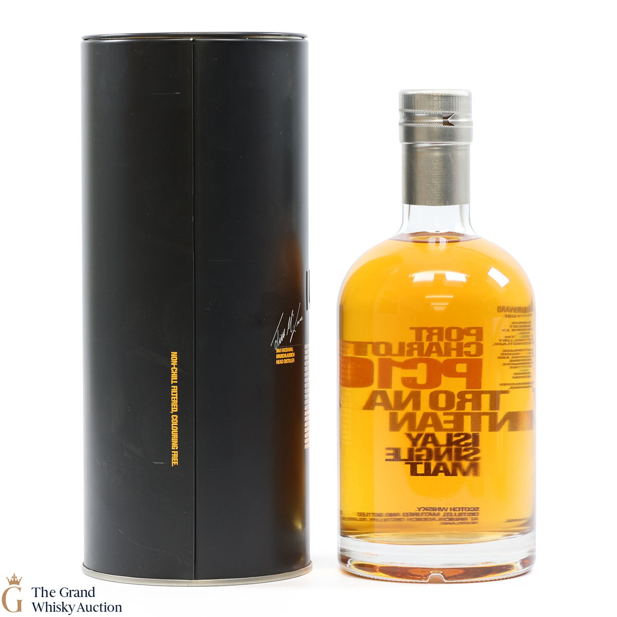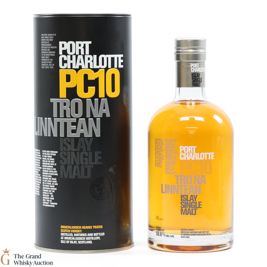Port Charlotte PC10, produced by Bruichladdich Distillery, is a heavily peated spirit. It was the first release of heavily peated Port Charlotte and was produced in 2001 from some of the first spirits to be produced after the distillery's reopening. The single malt was bottled at 10 years old and was limited to 6000 bottles.