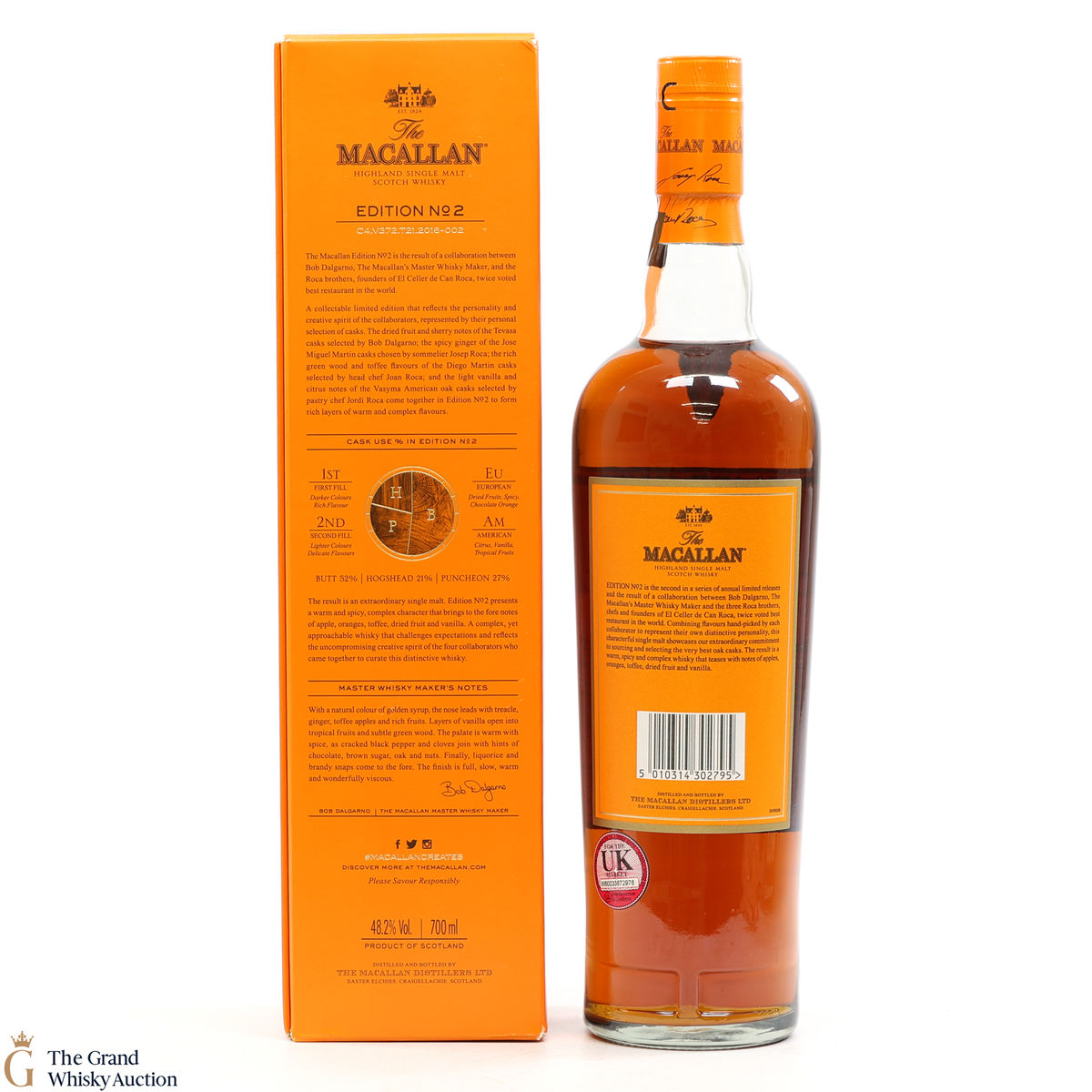 This is the second release from the Macallan Edition series. Edition No.2 is a collaboration between Macallan's master blender Bob Delgarno and legendary Spanish chefs Joan, Josep and Jordi Roca. The Rocas are the three brothers behind El Celler de Can Roca (named Best Restaurant in the World twice by Restaurant magazine). This single malt was drawn from a combination of sherry puncheons, butts and refill hogsheads.