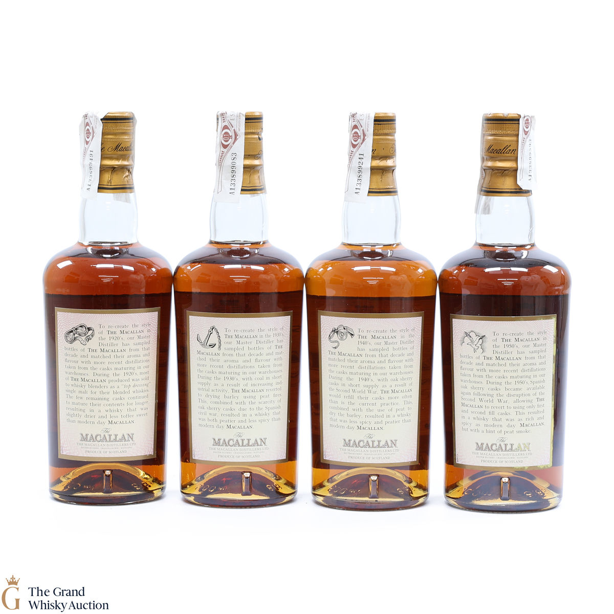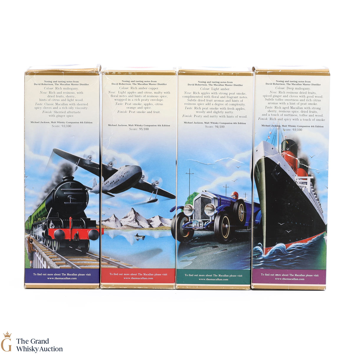 This lot includes a full set of the Macallan Travel Series: 1920s, 1930s 1940s & 1950s, each in their presentation boxes. 4 x 50cl.