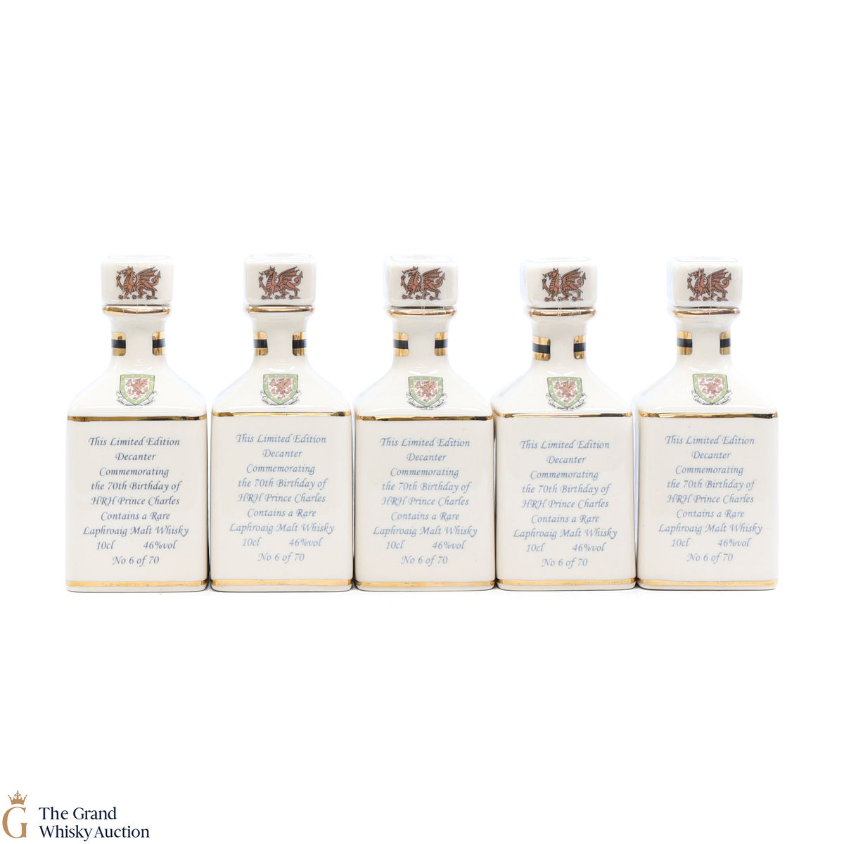 A mini decanter commemorating the 70th birthday of HRH Prince Charles. Filled with Laphroaig, this is one of 70 bottles released.