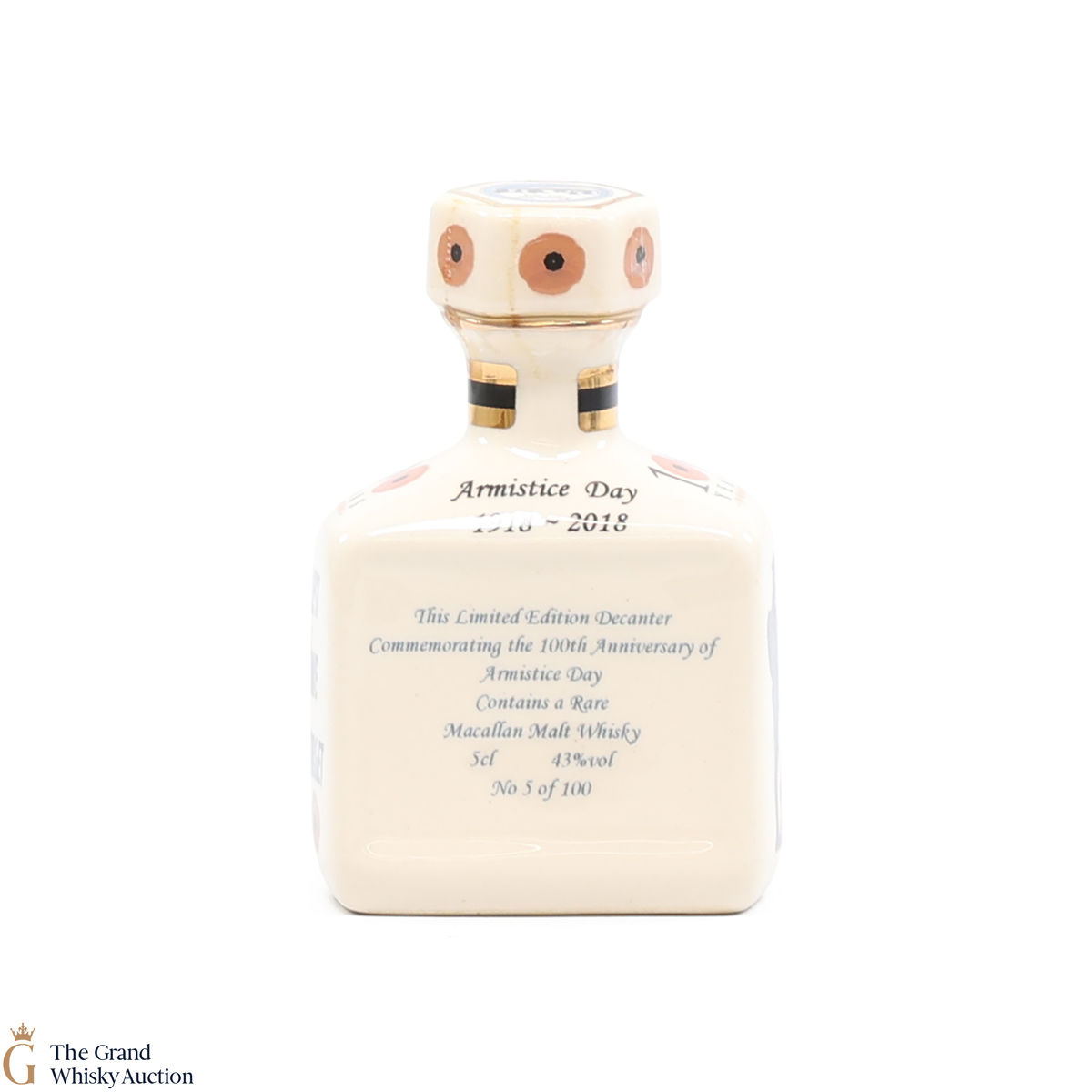 A mini decanter commemorating the 100th anniversary of the Armistice Day 1918-2018. Filled with a rare Macallan Malt Whisky, this is one of 100 bottles released.