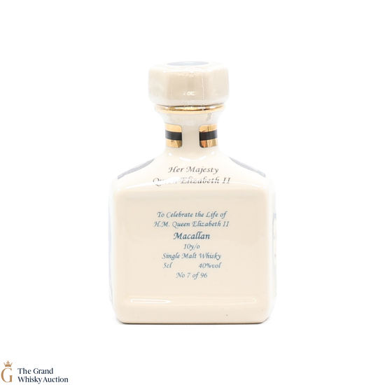 This is a mini decanter to celebrate the life of H.M Queen Elizabeth II. Filled with Macallan Single Malt Whisky, this is one of only 96 5cl bottles.