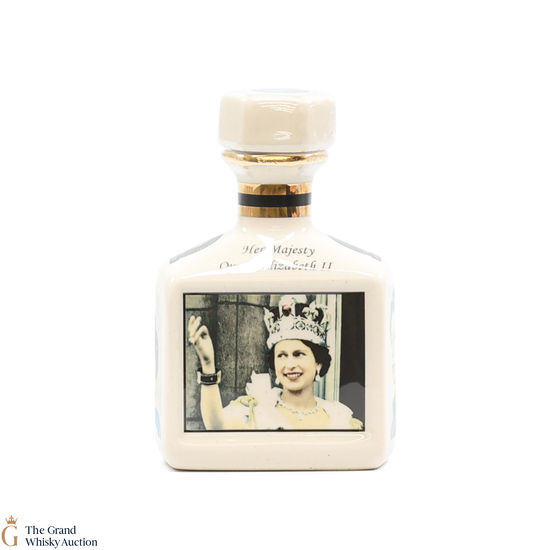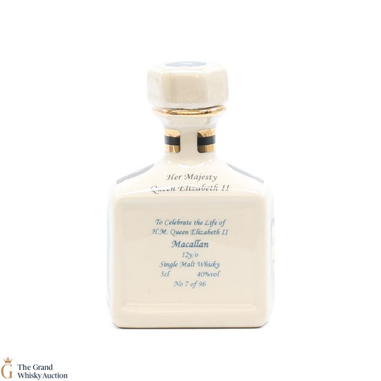 This is a mini decanter to celebrate the life of H.M Queen Elizabeth II. Filled with Macallan Single Malt Whisky, this is one of only 96 5cl bottles.