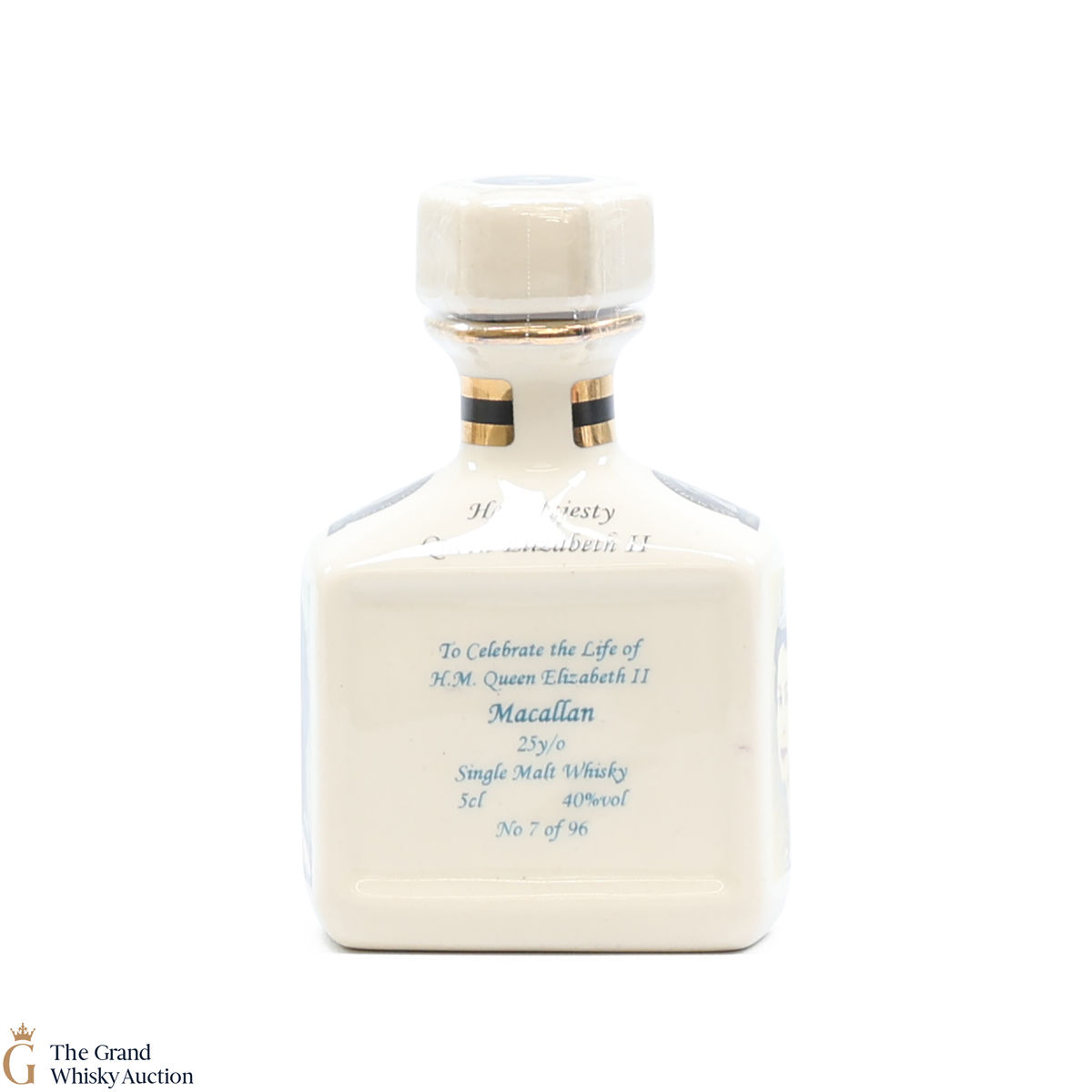 This is a mini decanter to celebrate the life of H.M Queen Elizabeth II. Filled with Macallan Single Malt Whisky, this is one of only 96 5cl bottles.