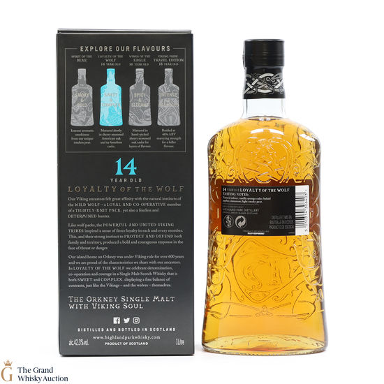 The 'Loyalty of the Wolf' by Highland Park is a 14-year-old single malt. This is a 1L bottle.
