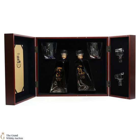 This Kavalan gift set includes 2 x 50cl decanters of single-cask whisky bottled at cask strength, two glasses, and two bottle stoppers;
