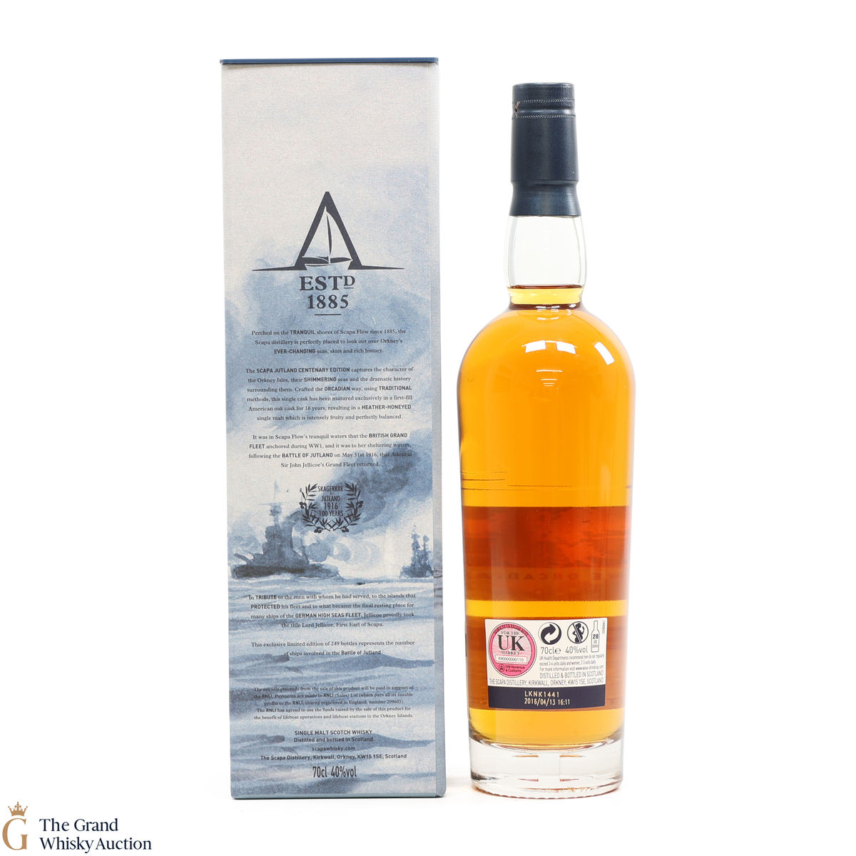 A special single cask bottling of Scapa, released in 2016 to commemorate the Battle of Jutland, which occurred in 1916, was bottled in tribute to the 249 ships that were involved in the Battle of Jutland. This is one of 249 bottles produced.