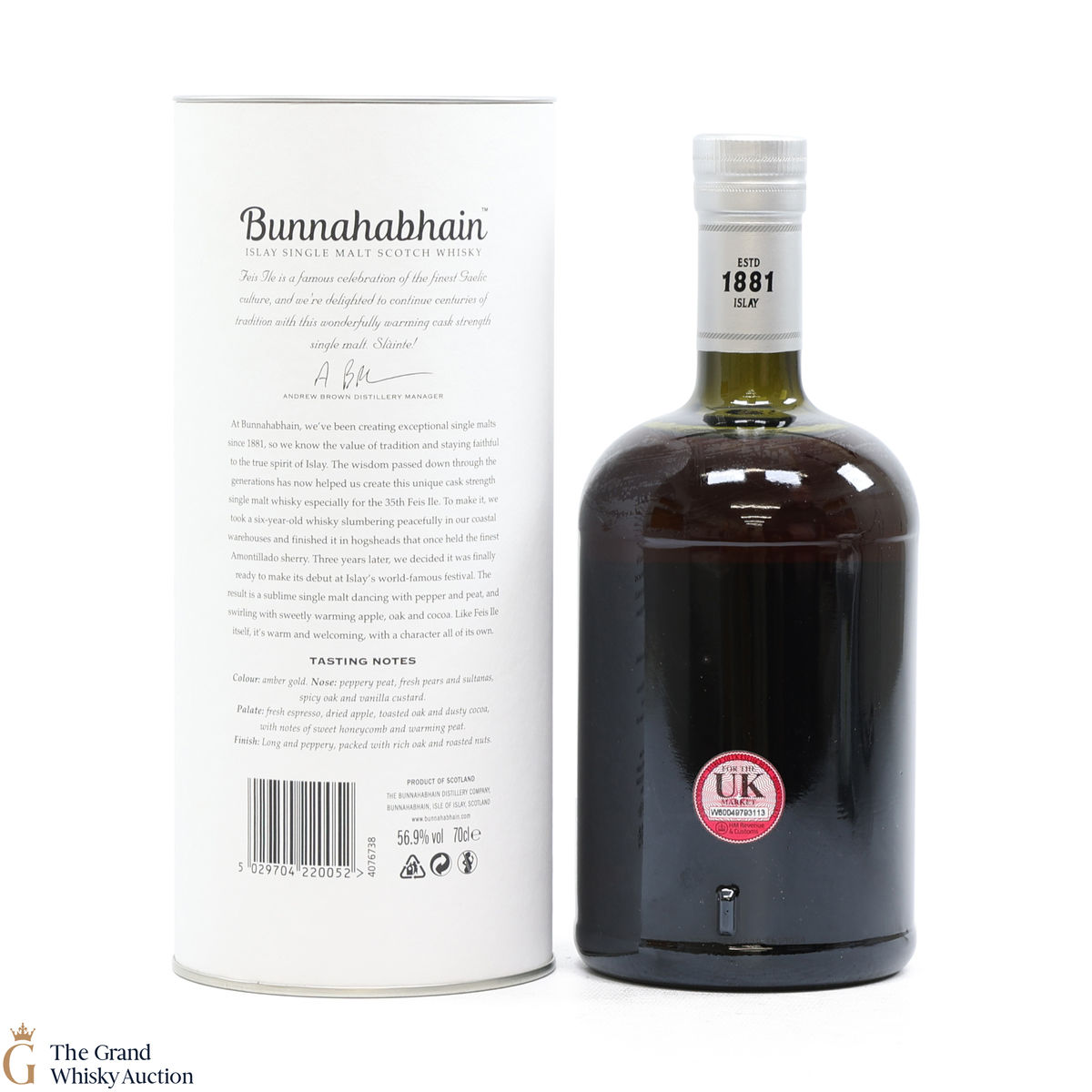 This limited edition single malt from Bunnahabhain Distillery was matured for 6 years in classic bourbon barrels, after which the single malt was transferred to Amontillado sherry Hogsheads for another three years. It was bottled at 56.9% and was released by Bunnahabhain for Fèis Ìle 2020. This is one of only 1658 bottles produced.