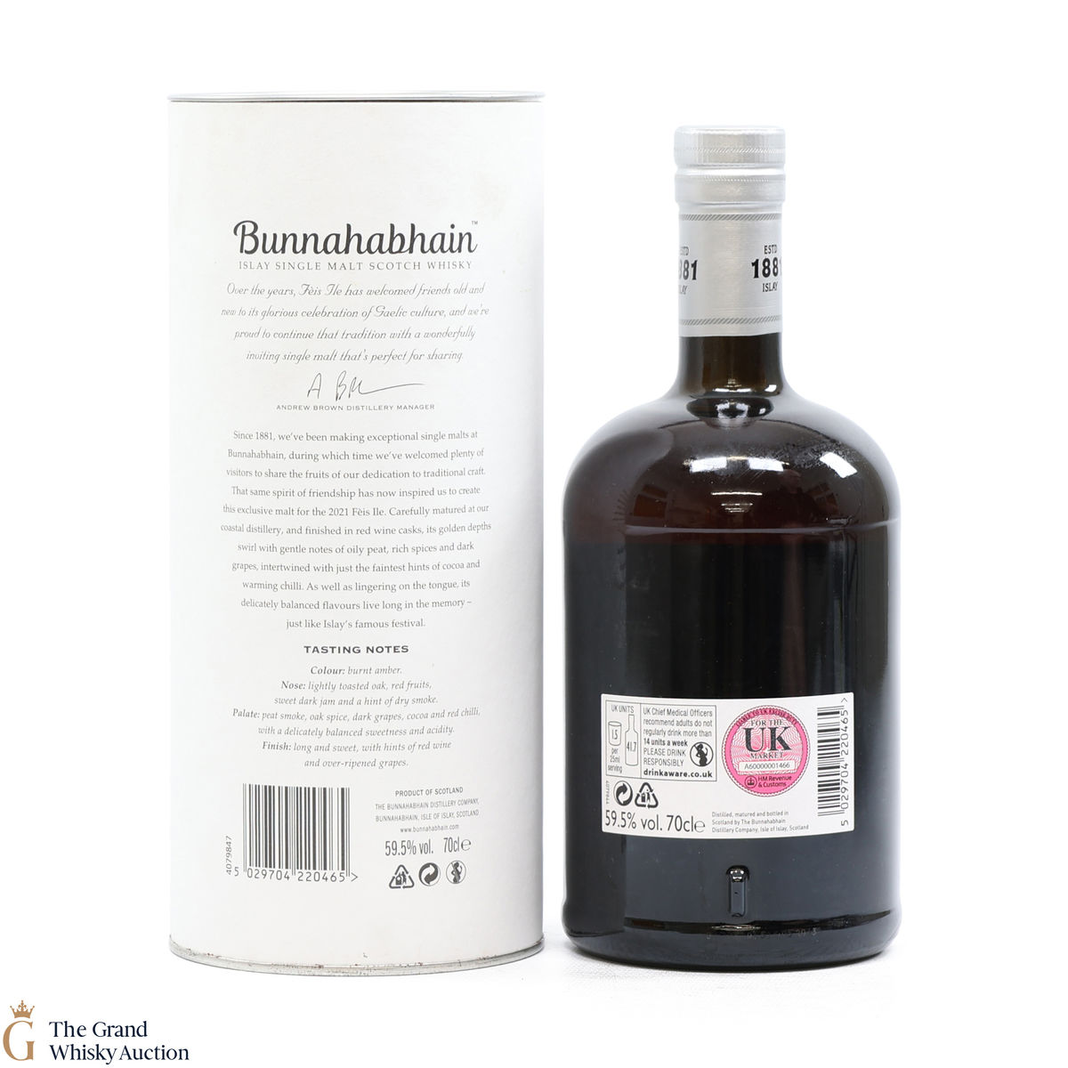 Bunnahabhain's first release for Feis Ile 2021 is this limited-edition smoky whisky. Distilled on the 10th of October 2013, this single malt was finished in Moine Bordeaux casks which gives the Bunnahabhain a delicately balanced flavour. Bottled on the 25th of November 2020, this is one of only 5166 bottles produced.