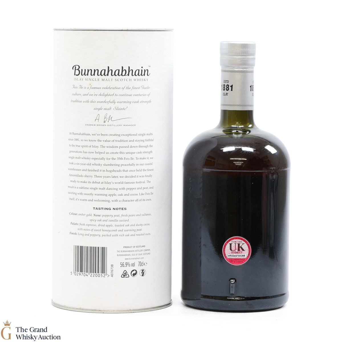 This limited edition single malt from Bunnahabhain Distillery was matured for 6 years in classic bourbon barrels, after which the single malt was transferred to Amontillado sherry Hogsheads for another three years. It was bottled at 56.9% and was released by Bunnahabhain for Fèis Ìle 2020. This is one of only 1658 bottles produced.