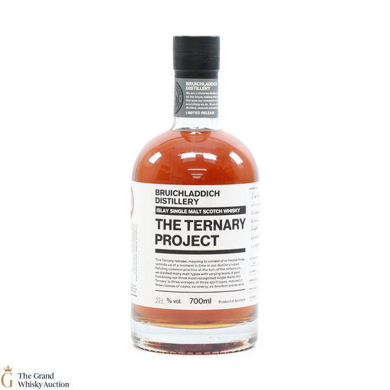 This limited release bottling from Bruichladdich Distillery is called the Ternary Project. This Ternary bottle is a combination of Bruichladdich's three most recognised single malts - three vintages of three spirit types, matured in three classes of casks; ex-sherry, ex-bourbon and ex-wine.