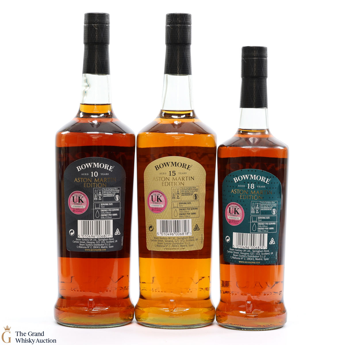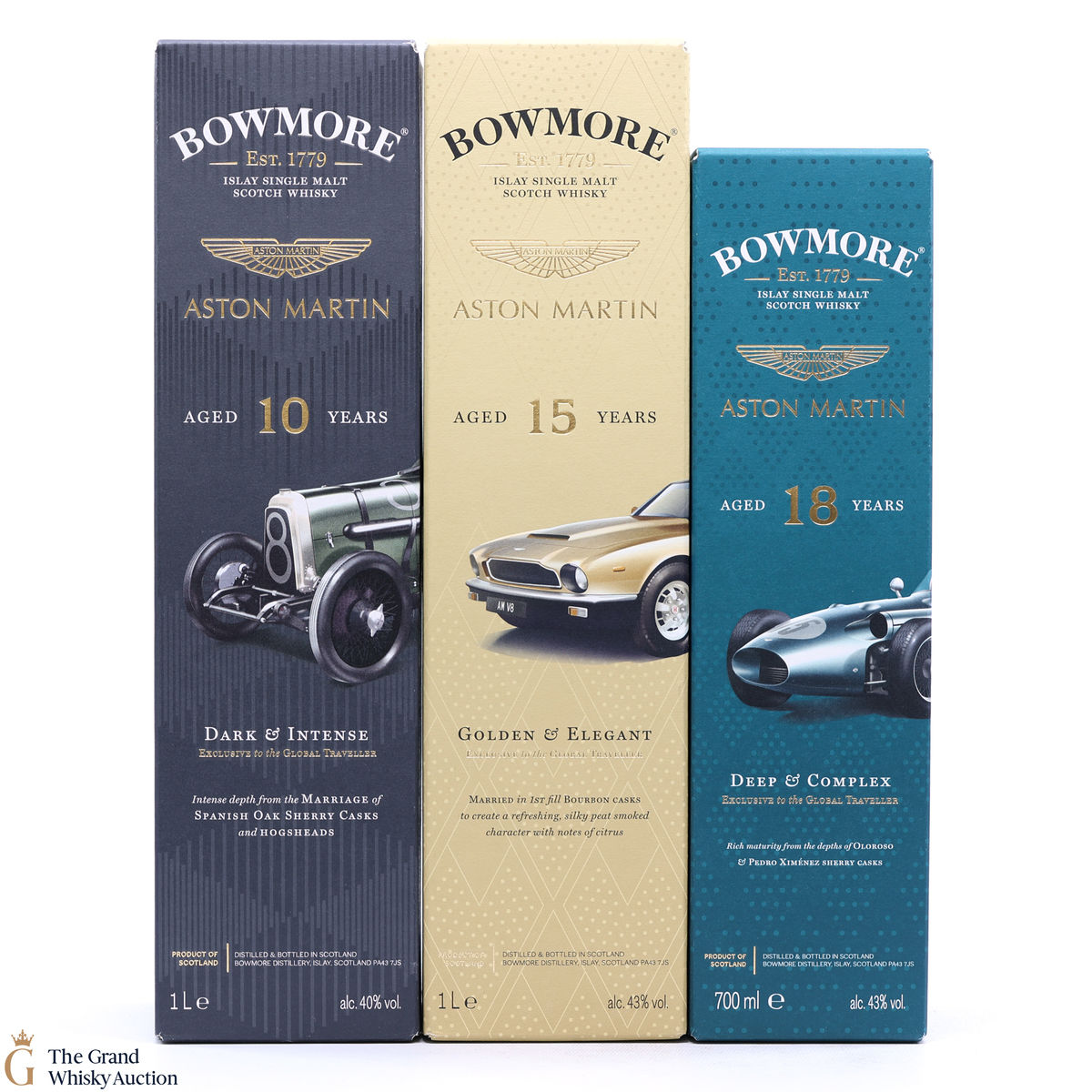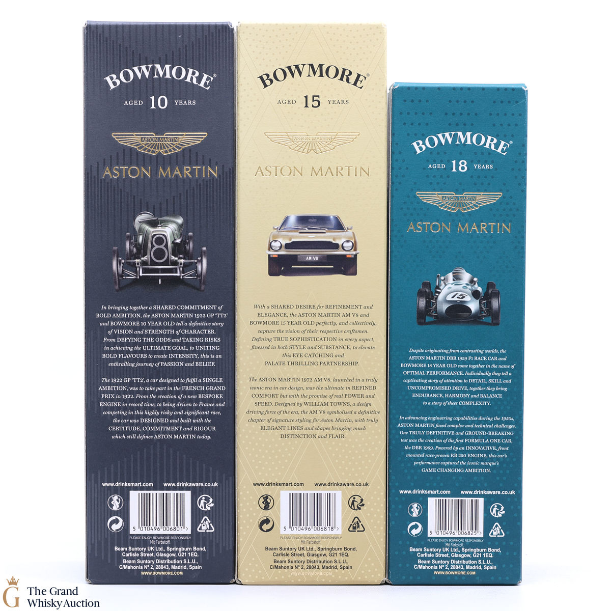 The full collection of the collaboration between Bowmore and Aston Martin, both creating timeless beauty and a lasting legacy. Each edition of the Aston Martin collection features a different car. Included in this lot is edition 4, 5 & 6.