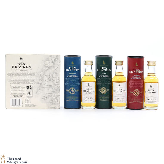 This Ben Bracken Tasting Set includes a selection of 3 single malt scotch whiskies from the Highlands, Islay and Speyside.