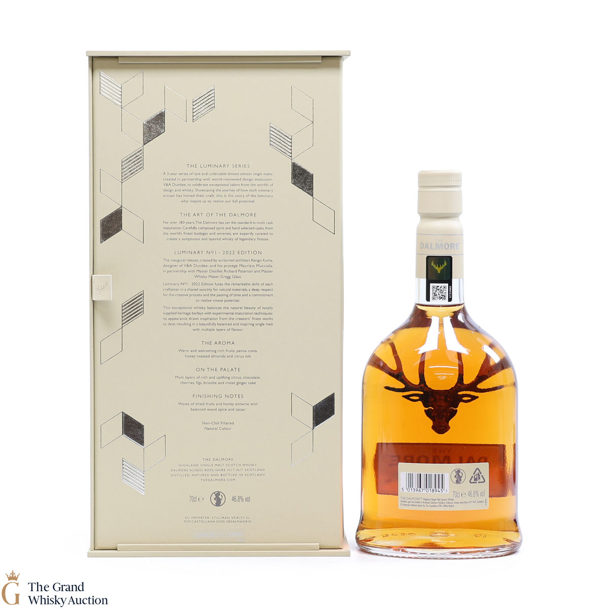 Dalmore is working with architect Kengo Kuma and protégé Maurizio Mucciola to create this single malt. After of 15 years aging in both Italian Amarone red wine casks, virgin "Kintsugi" casks crafted from a selection of Scottish Tay oak, Japanese mizunara, and American white oak.
