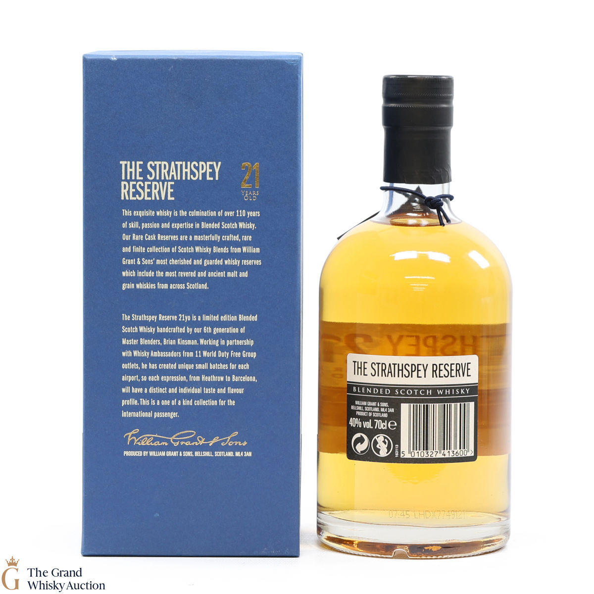 The Strathspey Reserve 21-year-old is a limited edition Blended Scotch Whisky selected from a minuscule batch of William Grant & Sons Rare Cask Reserves. Iy was handcrafted by Glenfiddich's 6th generation Master Blender, Brian Kinsman. Working in partnership with Whisky Ambassadors from 11 World of Whiskies outlets, he has created unique small batches for each airport, so each expression, from Heathrow to Barcelona, will have a distinct and individual taste and flavour profile.
