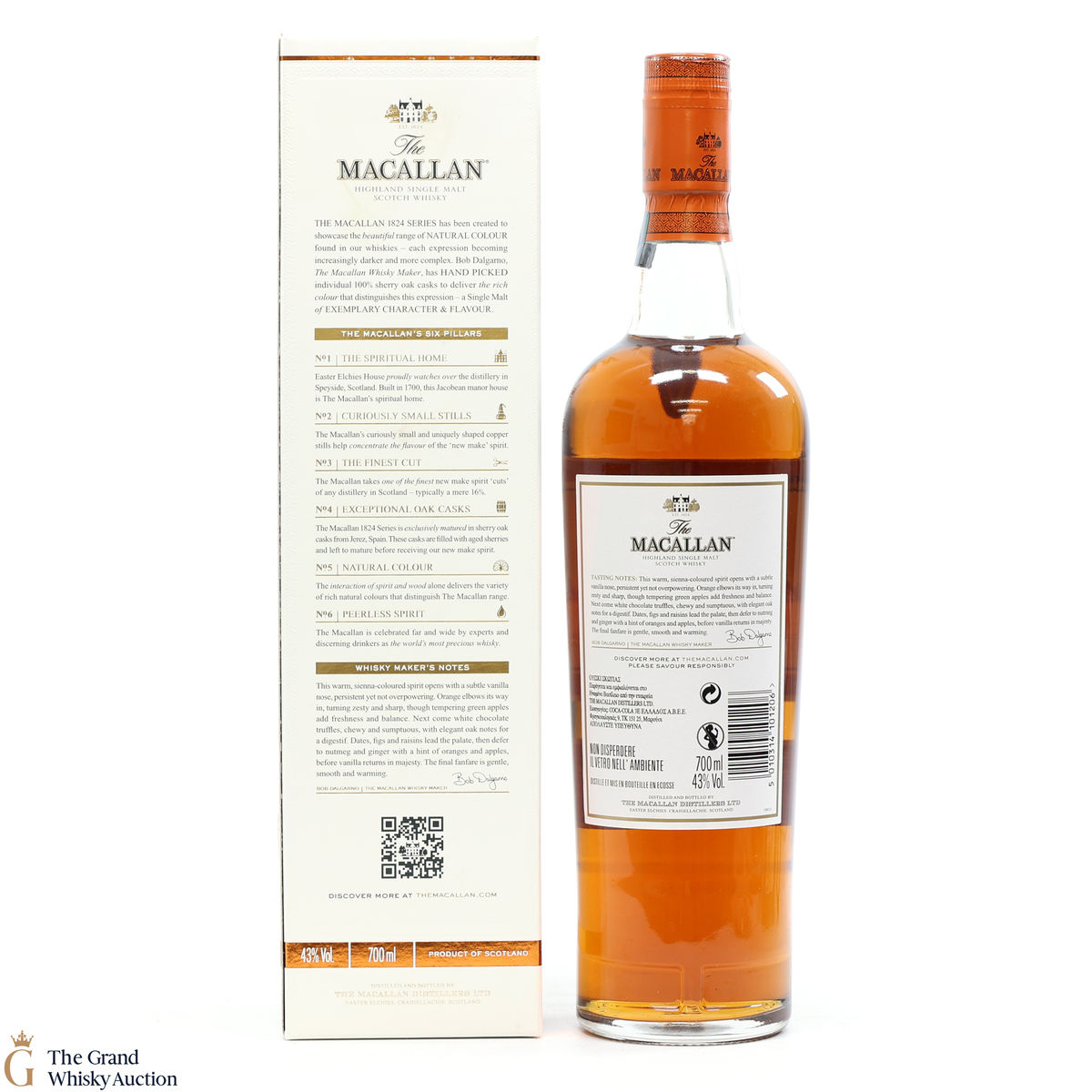 The Macallan 1824 Series celebrates natural colour. The most distinctive and defining characteristic of Macallan is the sherry-seasoned oak casks that are used to mature the whisky. This series shows commitment to 100% natural colour, drawn from wood. The colour of each expression becomes deeper as the range progresses.