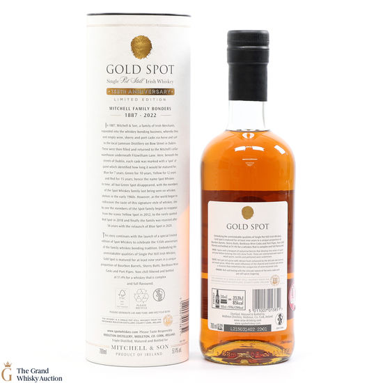 Matured for at least nine years in bourbon barrels, Sherry butts, Bordeaux wine casks, and Port pipes. Gold Spot is non-chill-filtered and bottled at 51.4% ABV.