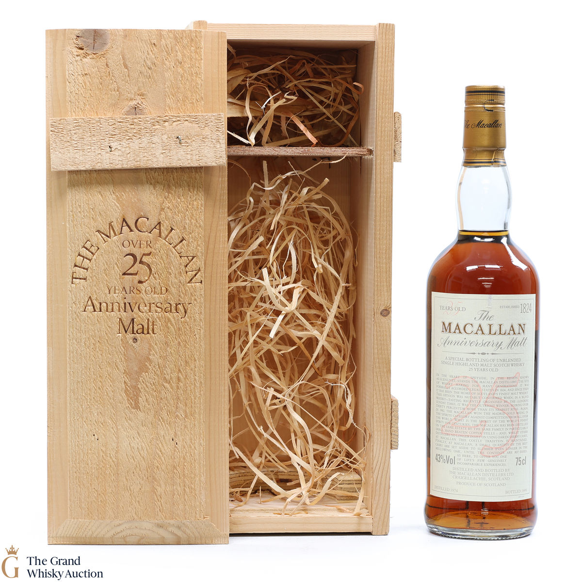This is an incredibly rare 25 year old Speyside single malt. It was distilled at The Macallan in 1974. It was bottled in 1999 for the highly decorated Anniversary Malt range. This a 70cl bottle.
