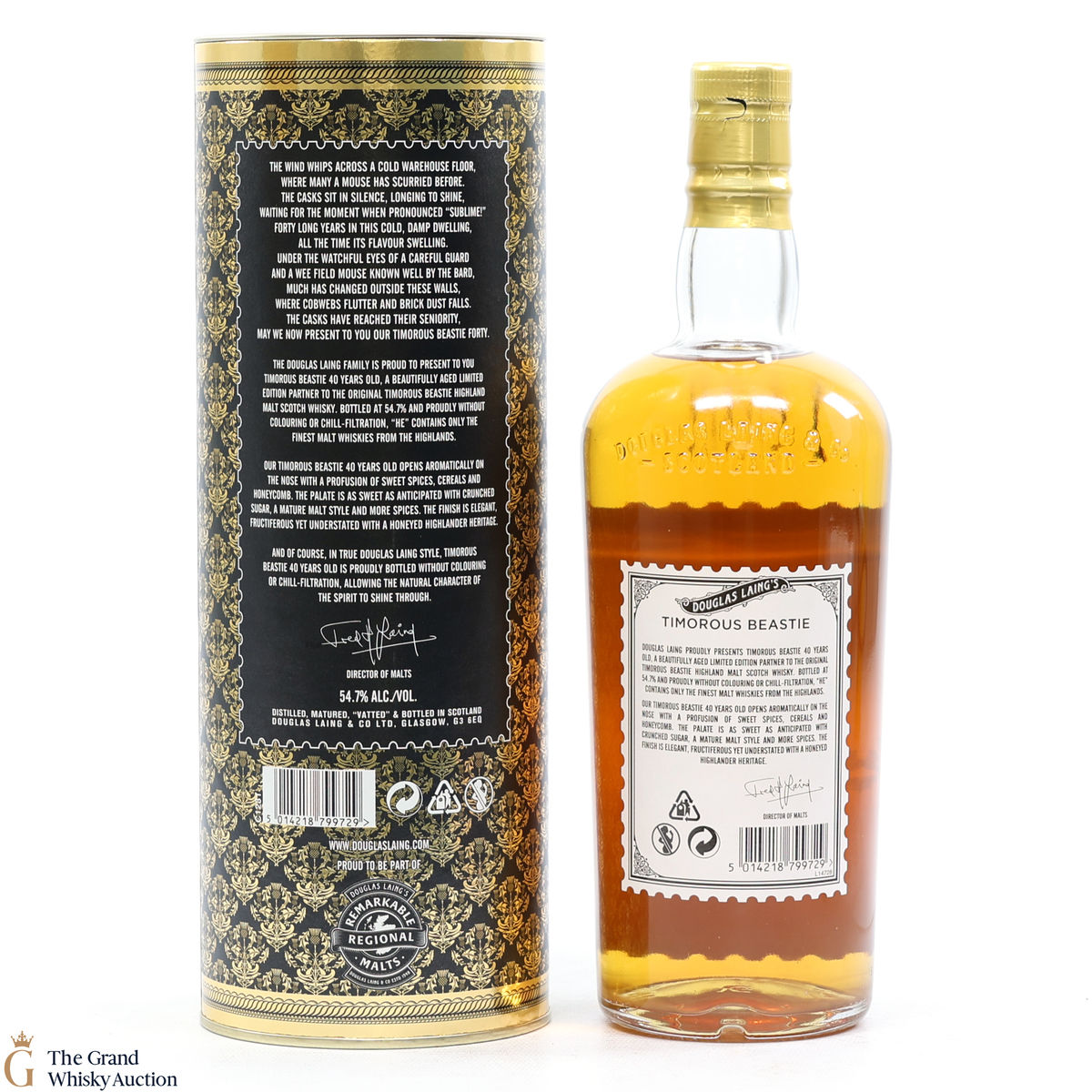This Timorous Beastie Highland blended malt Scotch whisky was matured for 40 years and bottled at the cask strength of 54.7% ABV. Distilled, matured, vatted and bottled by Douglas Laing & Co. Ltd. This is one of just 1,080 bottles produced.