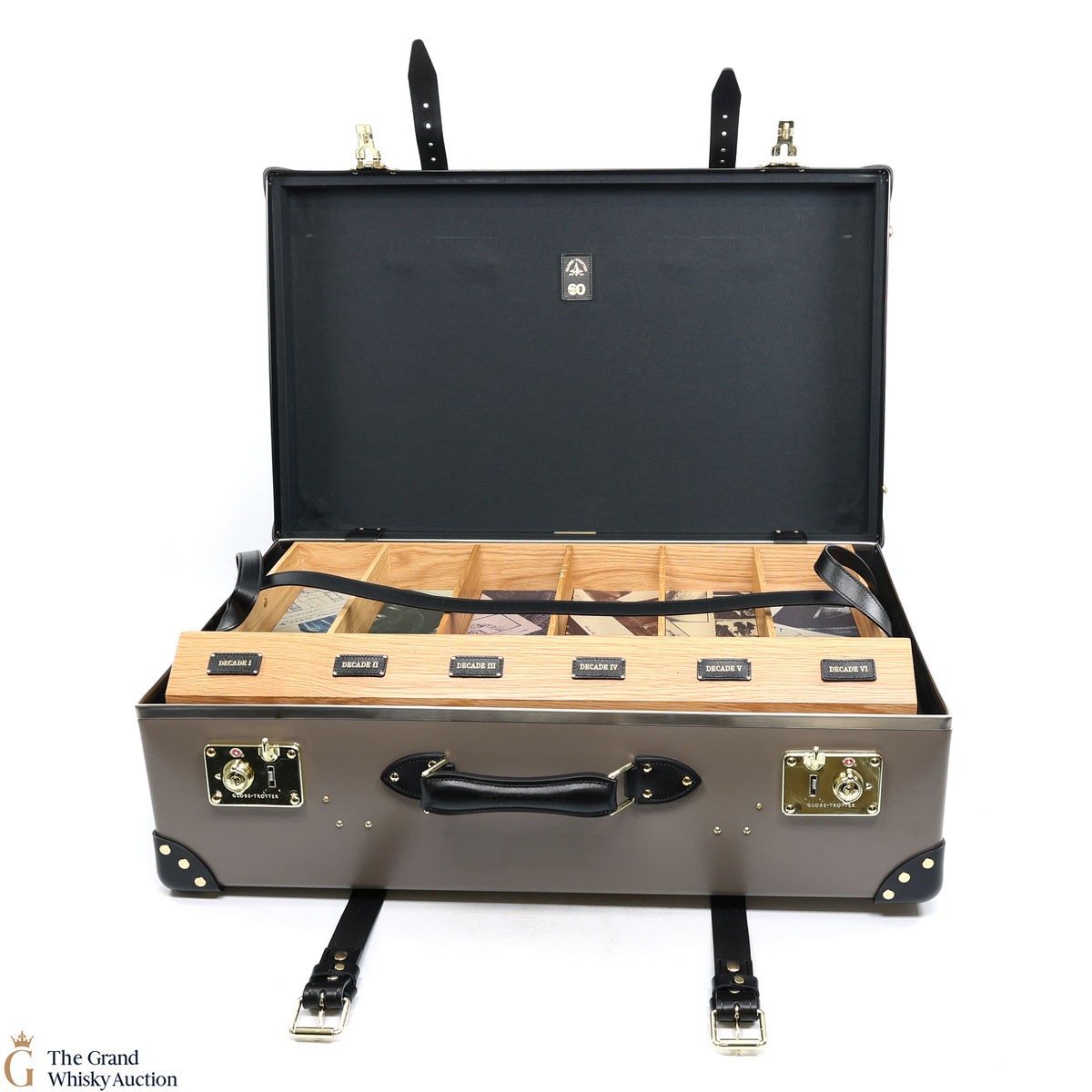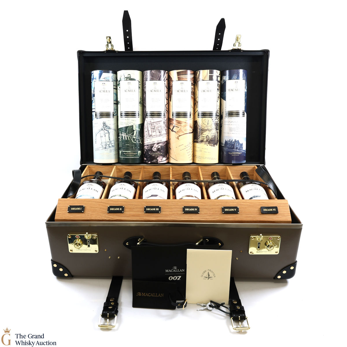 This lot also includes a luxury presentation travel case from Globe-Trotter, made to fit each of the Macallan - James Bond 60th Anniversary - Decade bottles.