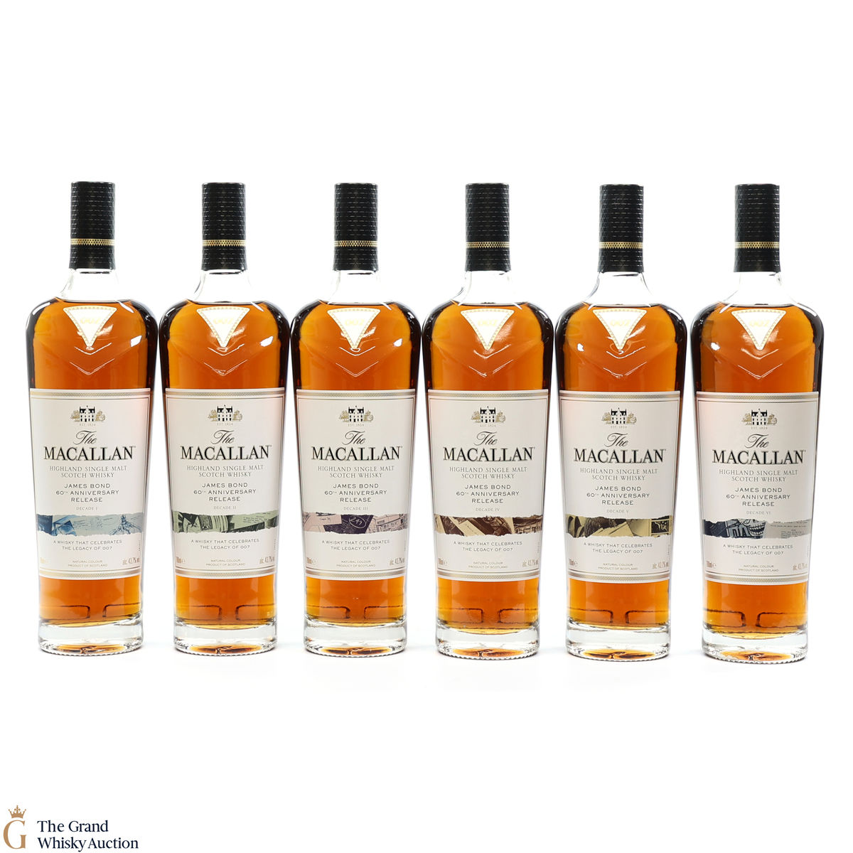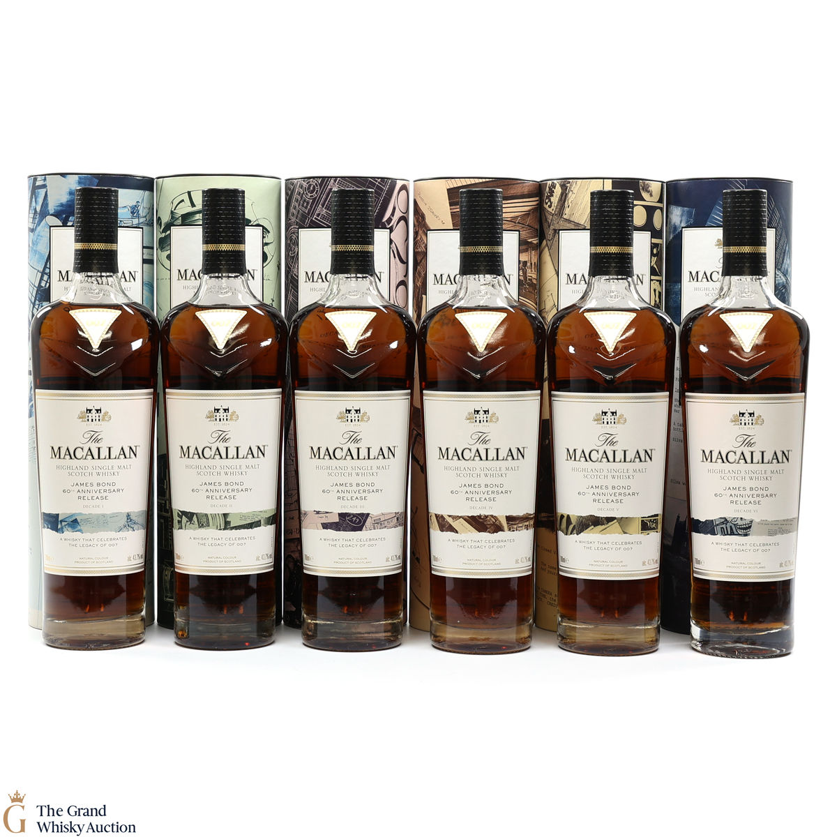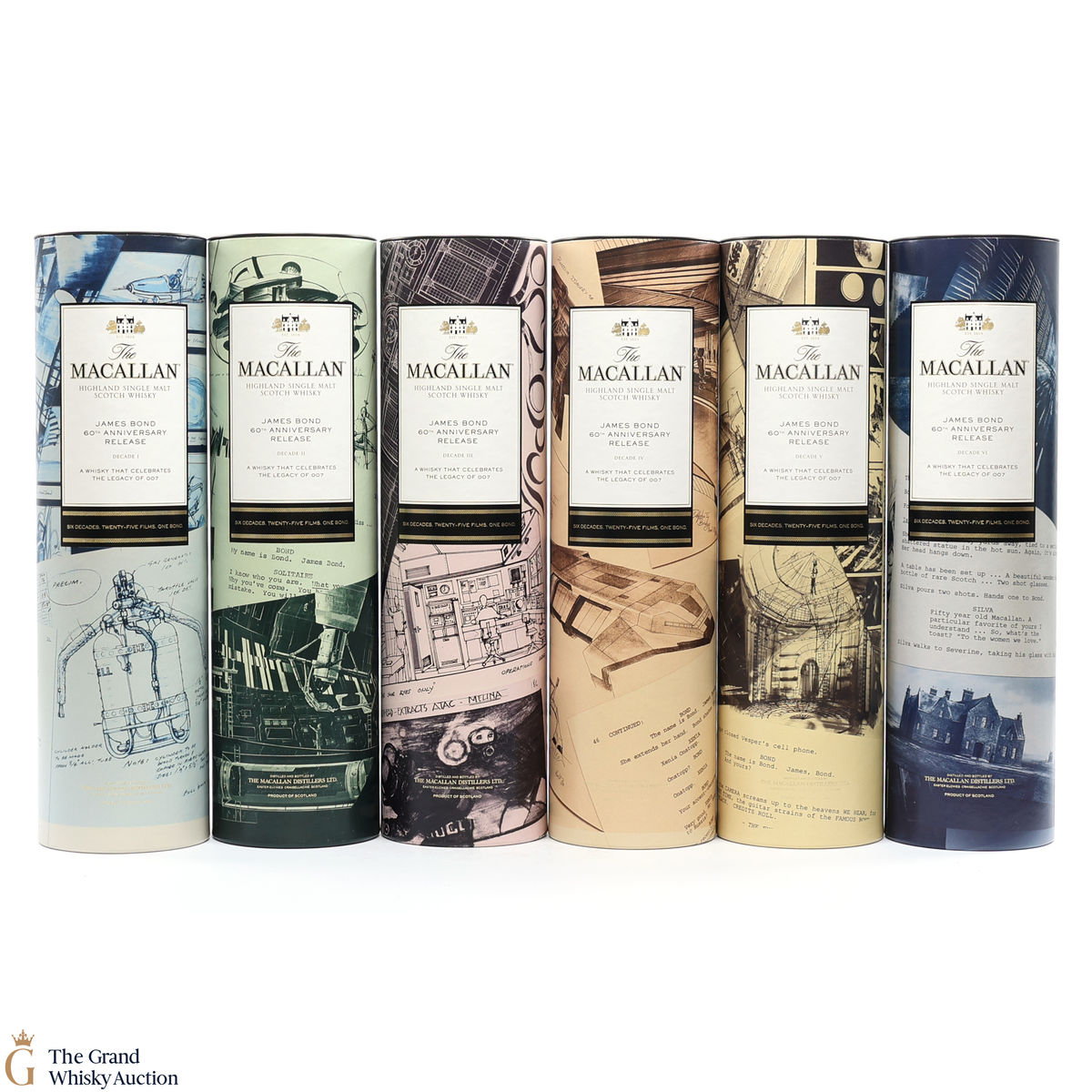 The remarkable James Bond 60th Anniversary Release is a celebration of 007 and The Macallan as modern innovators linked by their Scottish heritage. Each bottle’s packaging features an original illustrative design and colour to denote the decade it represents.