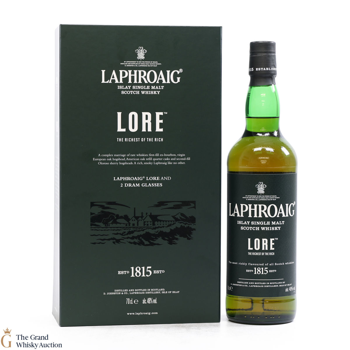 Included in this lot is 1 x 70cl Laphroaig Lore and 2 x dram glasses.