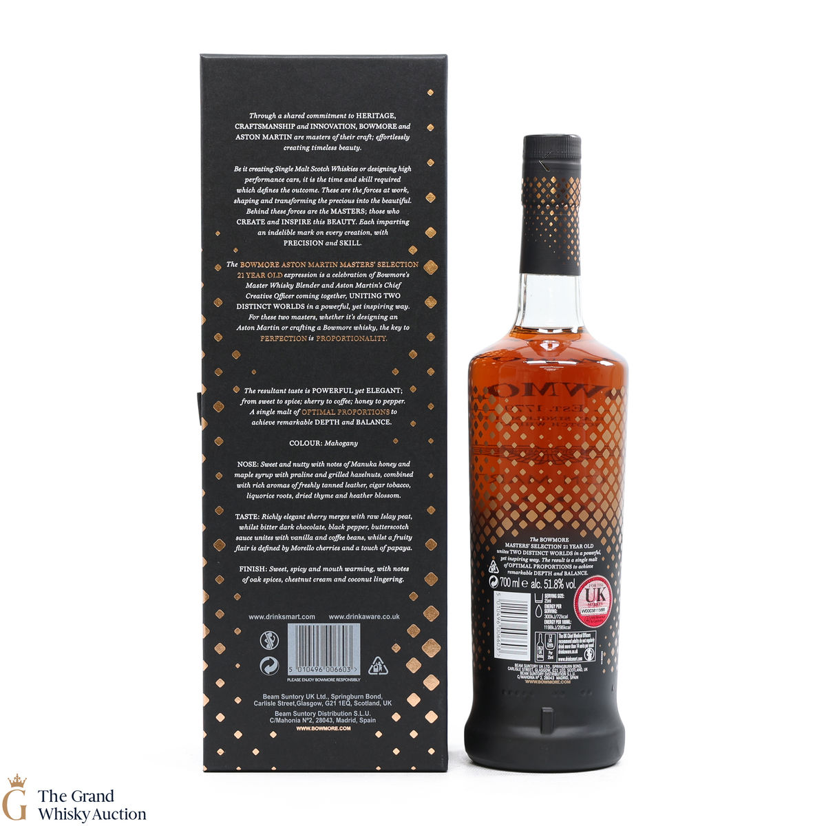 This 21-Year-Old Bowmore is a limited-edition single malt created in collaboration between Ron Welsh, Bowmore Master Blender and Marek Reichman, Aston Martin Chief Creative Officer. Matured in a combination of oloroso and Pedro Ximenez sherry casks. The result is a single malt that thrills all the senses for optimal enjoyment.