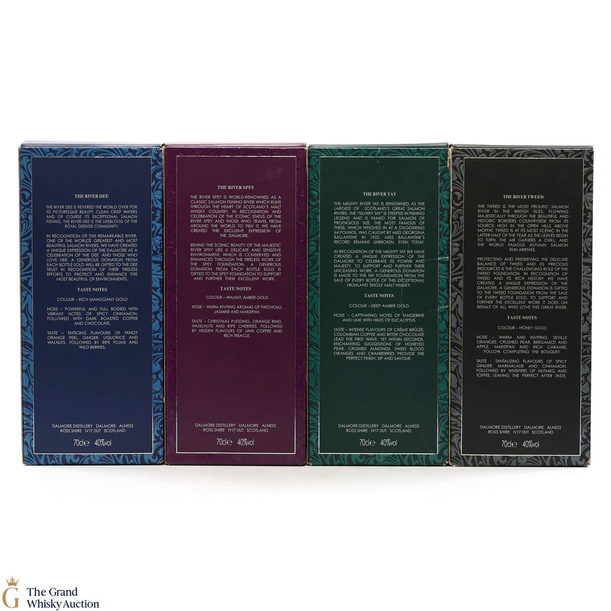 The Dalmore Rivers Collection includes four bottlings named after four famous Scottish Salmon rivers, The Dee, The Spey, The Tweed and The Tay. Each expression was bottled at 40%. This lot includes 4 x 70cl bottlings.