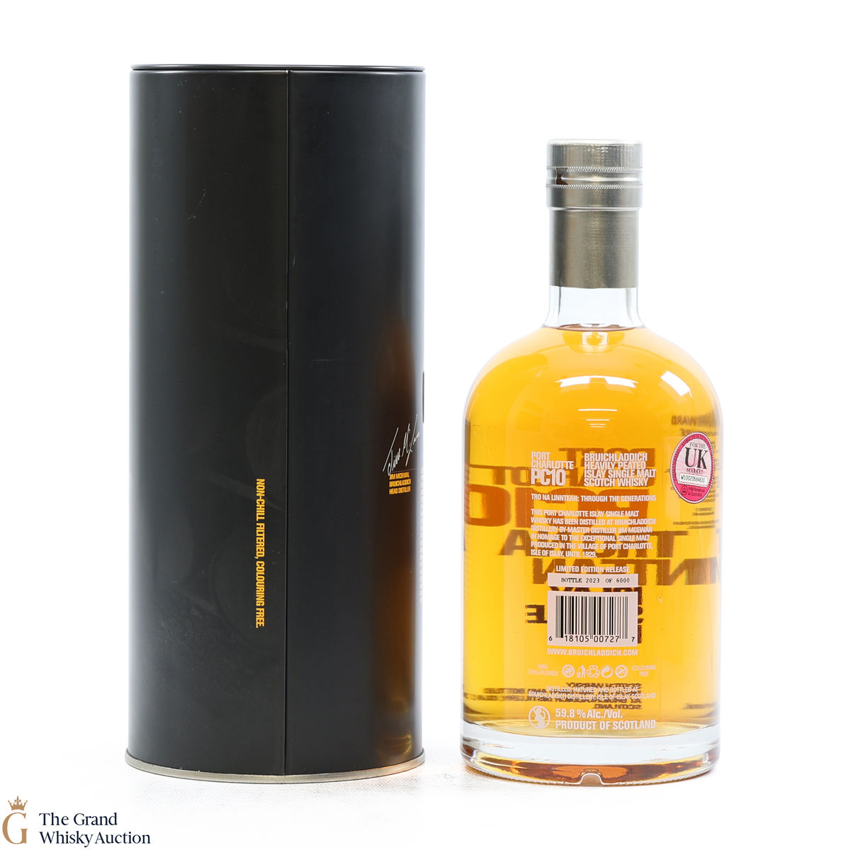 Port Charlotte PC10, produced by Bruichladdich Distillery, is a heavily peated spirit. It was the first release of heavily peated Port Charlotte and was produced in 2001 from some of the first spirits to be produced after the distillery's reopening. The single malt was bottled at 10 years old and was limited to 6000 bottles.