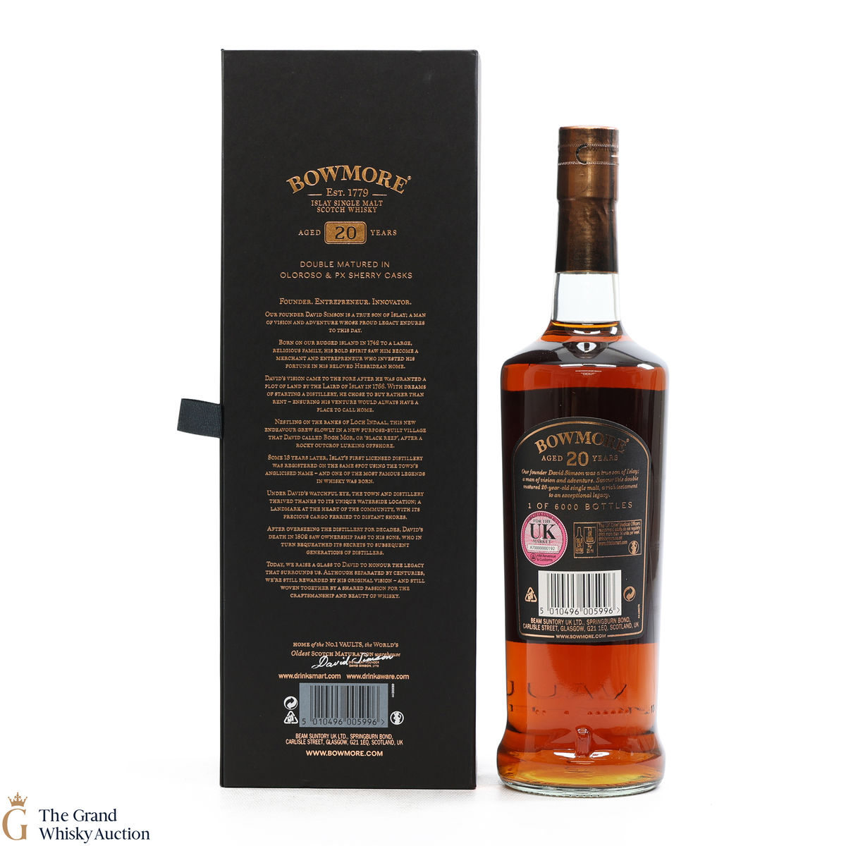 This 20-year-old celebrates and is a testament to the founder of Bowmore. This dram has gone through a double maturation period of 15 years in Oloroso Sherry Butts followed by 5 years in a first fill PX Butts. One of only 6000 bottles.