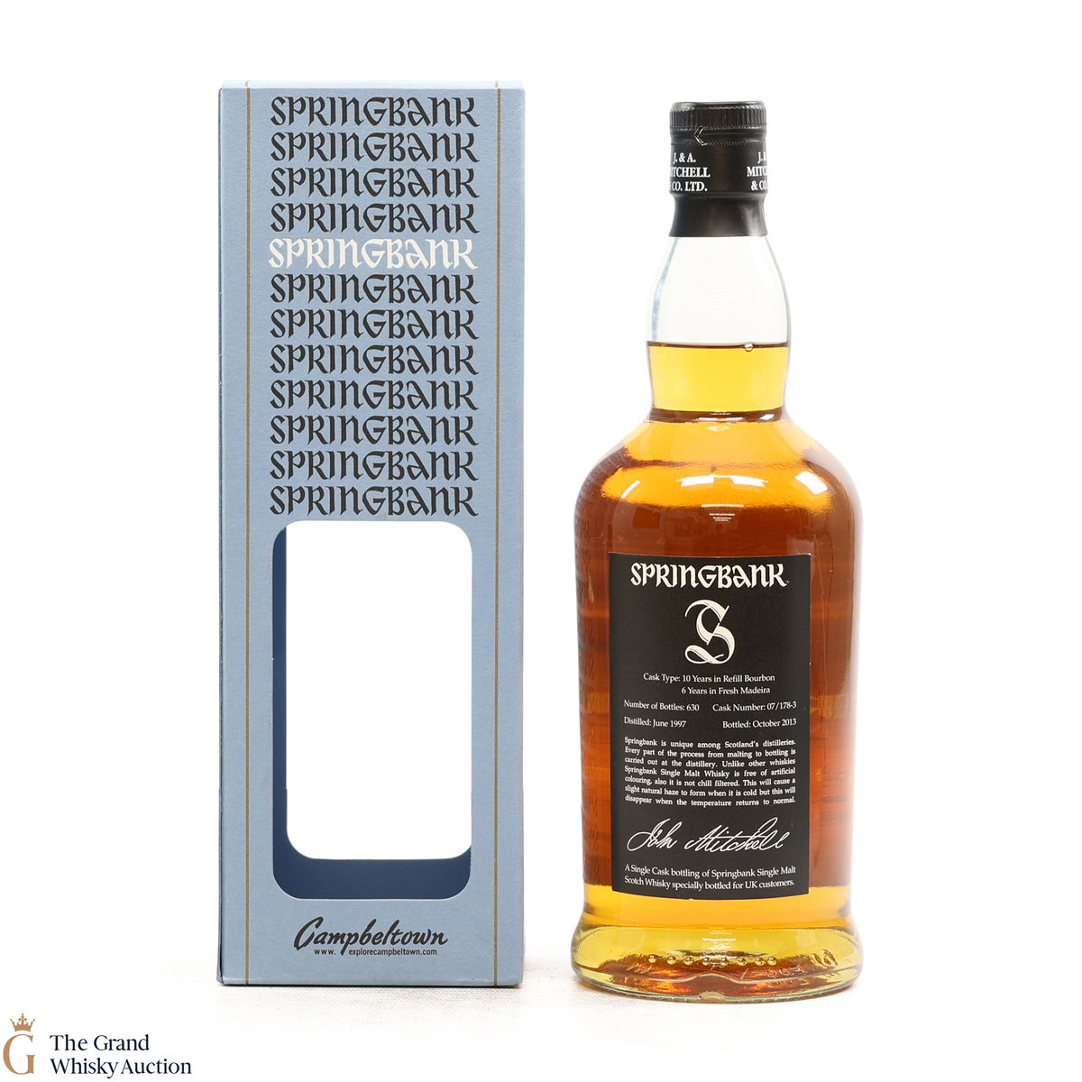A 1997 single cask Springbank matured in a single refill bourbon cask for 10 years then transferred into a fresh Madeira cask for another six years. Bottled in October 2013 from cask number 07/178-3 at the cask strength of 54%. This is one of 630 bottles. A UK exclusive bottling.