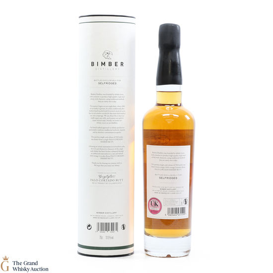 An exclusive partnership between the London distillery and department store Selfridges. This Bimber was made from single farm barley (which was malted at Westminster Maltings) and matured in a single Palo Cortado butt.