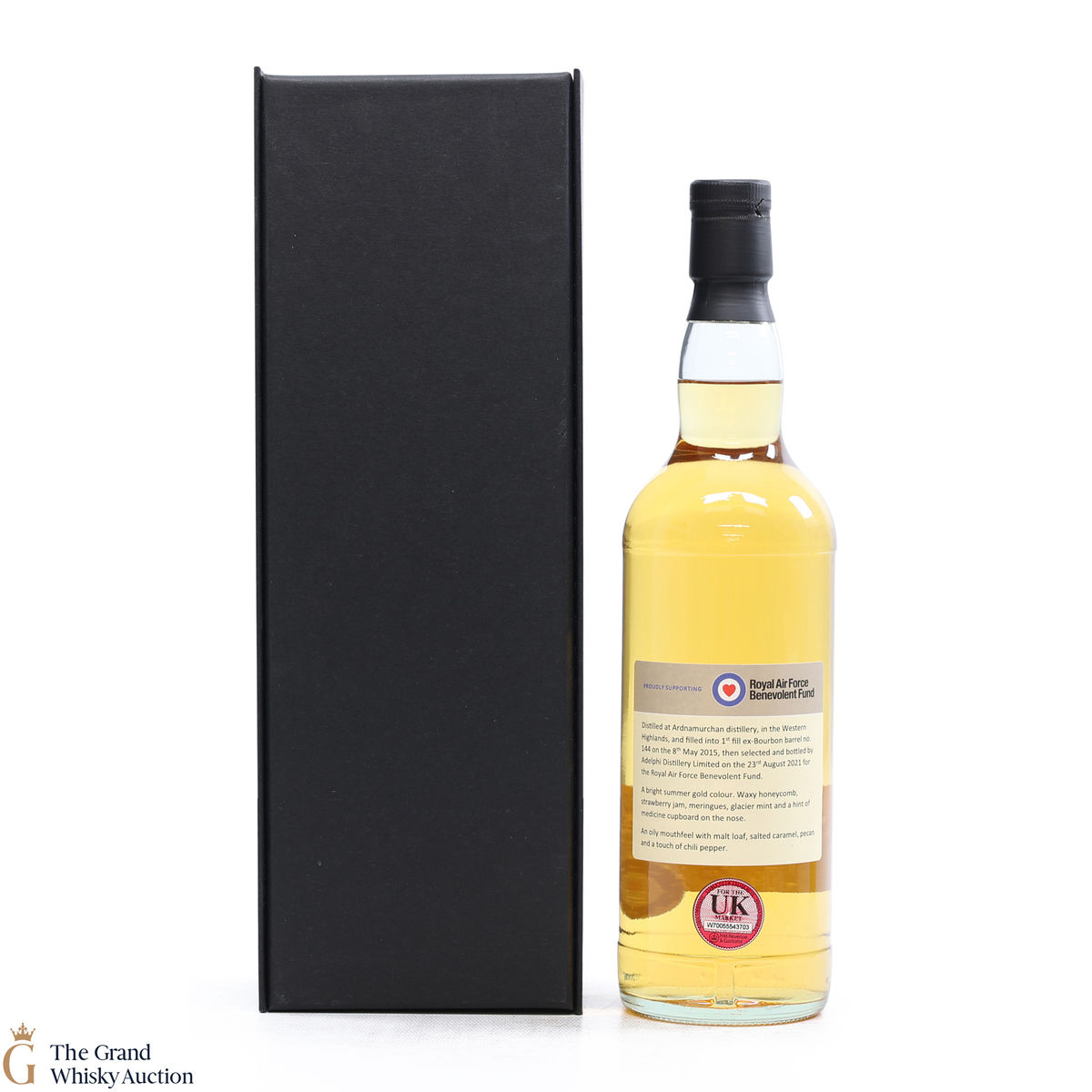 Independent bottler Adelphi released this Ardnamurchan in 2021 exclusively for the Royal Air Force Benevolent Fund. Filled in May 2105 and then bottled on the 23rd August 2021 from barrel #144 this 1st fill ex-bourbon was bottled at 59.1% ABV. One of only 250 bottles.