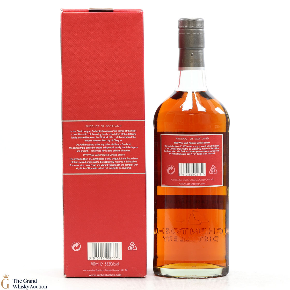 This limited-edition bottle of Auchentoshan 1999 Wine Cask Matured. Matured for nine years in St Julien Bordeaux wine casks, in limousin oak for a unique flavour.