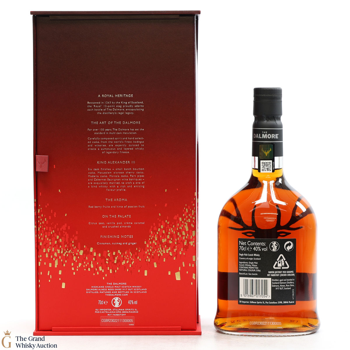 To make The Dalmore King Alexander III, Master Distiller Richard Paterson specially selected 6 casks of differently aged Dalmore malts matured in wine, Madeira, sherry, marsala, Kentucky bourbon and port casks. A remarkable feat of blending crafted to honour the act of saving Scotland's King in 1263. It is a rich, fruity Highland single malt.