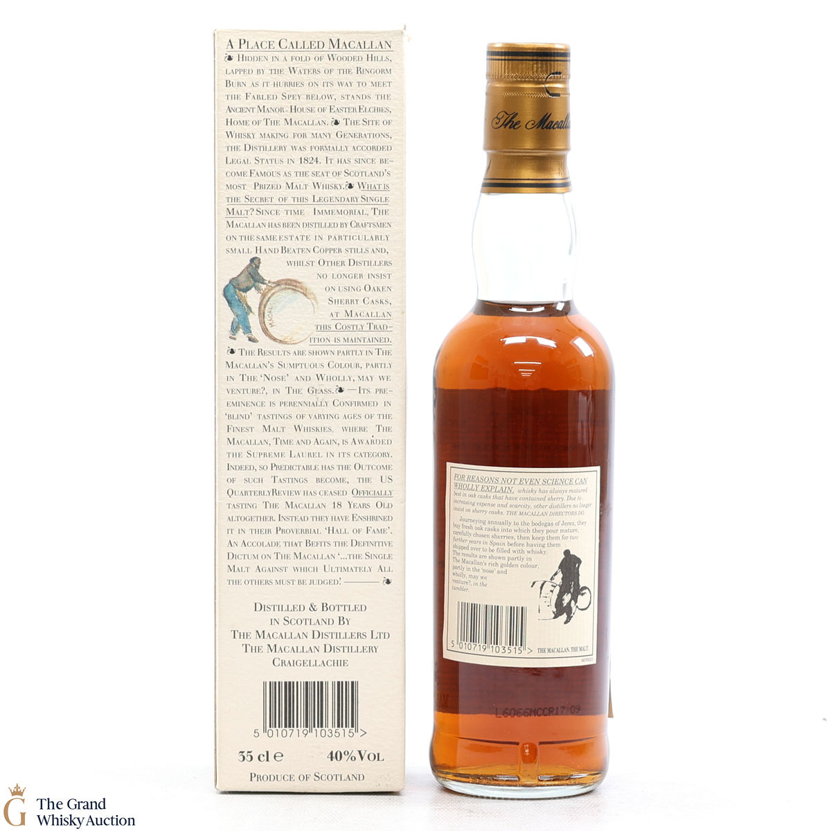 This is an older style of bottling of the famous Macallan 10-year-old malt whisky. It comes presented in the all-white box showing Easter Elchies House, which is increasingly hard to find. This malt was matured in sherry wood.