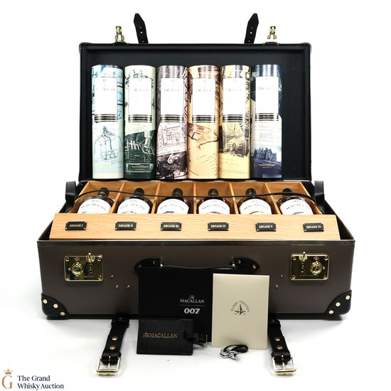 This lot also includes a luxury presentation travel case from Globe-Trotter, made to fit each of the Macallan - James Bond 60th Anniversary - Decade bottles.
