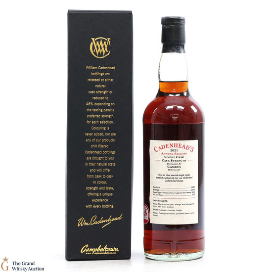 Bottled by Cadenhead's, this Cambus single grain has been matured for 30 years and bottled at cask strength. Distilled in 1991, matured for 30 years and finished in an Oloroso cask. One of 270 bottles produced.