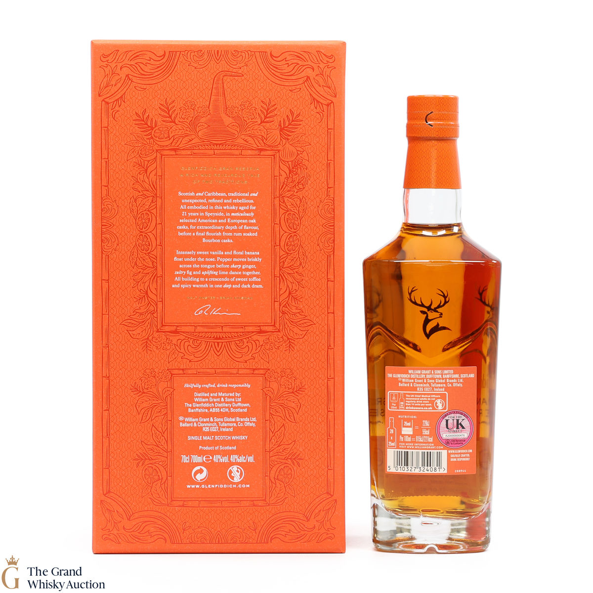 The Glenfiddich Gran Reserva has matured and mellowed in American Oak Casks for 21 years before being finished in previously used Caribbean Rum casks for 4 months.
