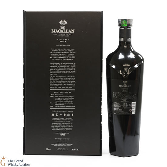 The Macallan Rare Cask Black Limited Edition was released to celebrate the opening of the new Macallan Distillery. It is part of the Macallan 1824 series and features stunning photography by Paolo Pellegrin and a bespoke flask from the Distillery Visitor Centre. The release was a limited edition of 7000 sets, which were only available at airports.