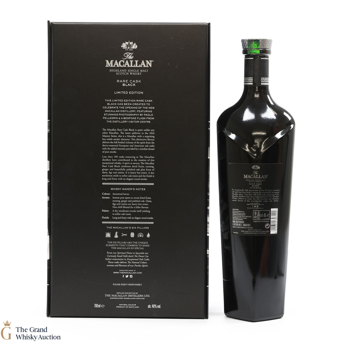 The Macallan Rare Cask Black Limited Edition was released to celebrate the opening of the new Macallan Distillery. It is part of the Macallan 1824 series and features stunning photography by Paolo Pellegrin and a bespoke flask from the Distillery Visitor Centre. The release was a limited edition of 7000 sets, which were only available at airports.