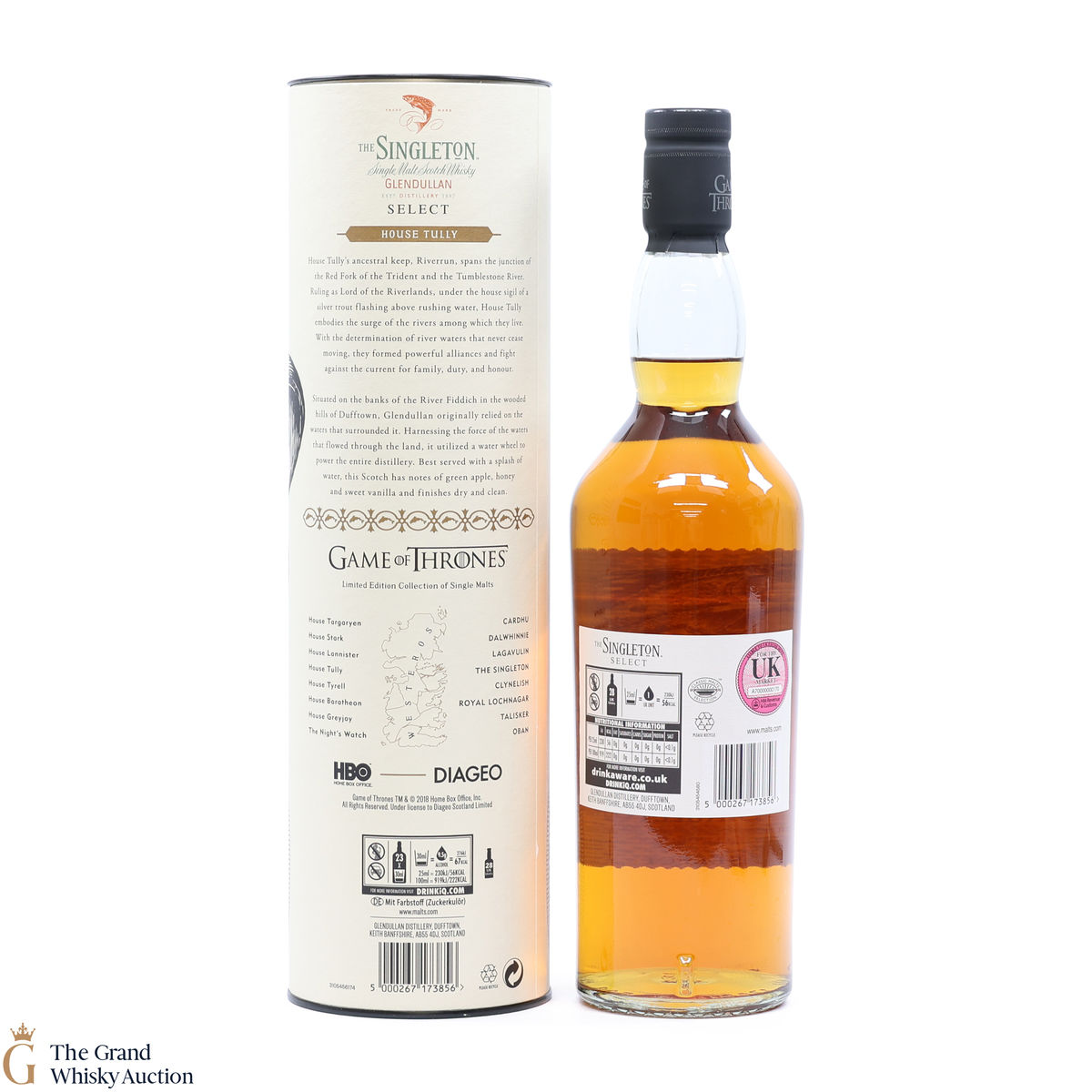 The Singleton Glendullan Reserve hails from Dufftown distillery. Glendullan is located on the banks of the River Fiddich, so it has been cleverly paired with House Tully at Riverrun, which is in the region known as The Riverlands. This single malt Scotch whisky is decorated with a jumping trout - the sigil of House Tully.