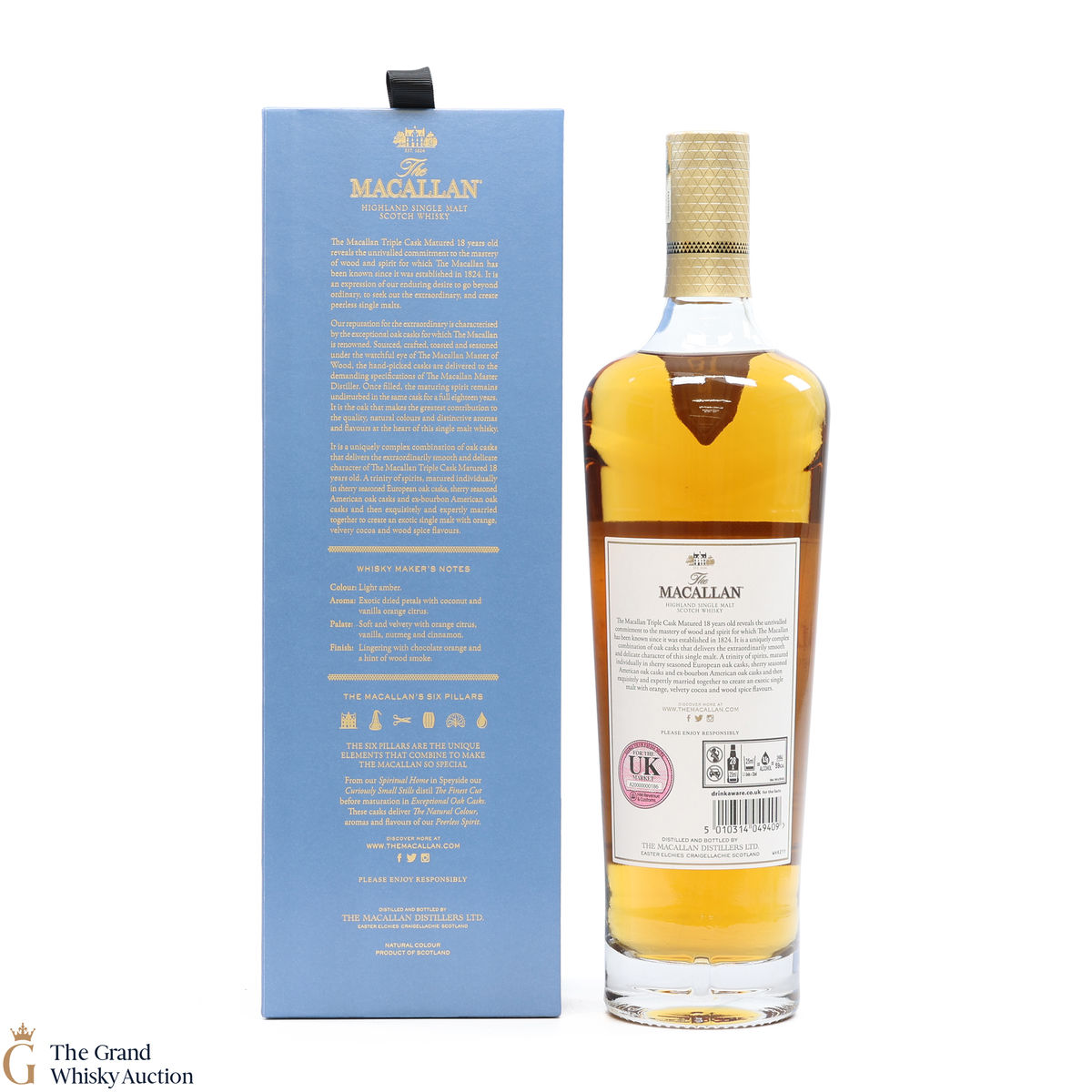 This 18 year old Macallan single malt was released in 2018 and sits is at the top of the Triple Cask range (which replaced the Fine Oak range). The whisky was matured in a combination of European sherry seasoned casks, American sherry seasoned casks and American ex-bourbon casks. This expression boasts bountiful notes of vanilla, dried fruit and woody spice.