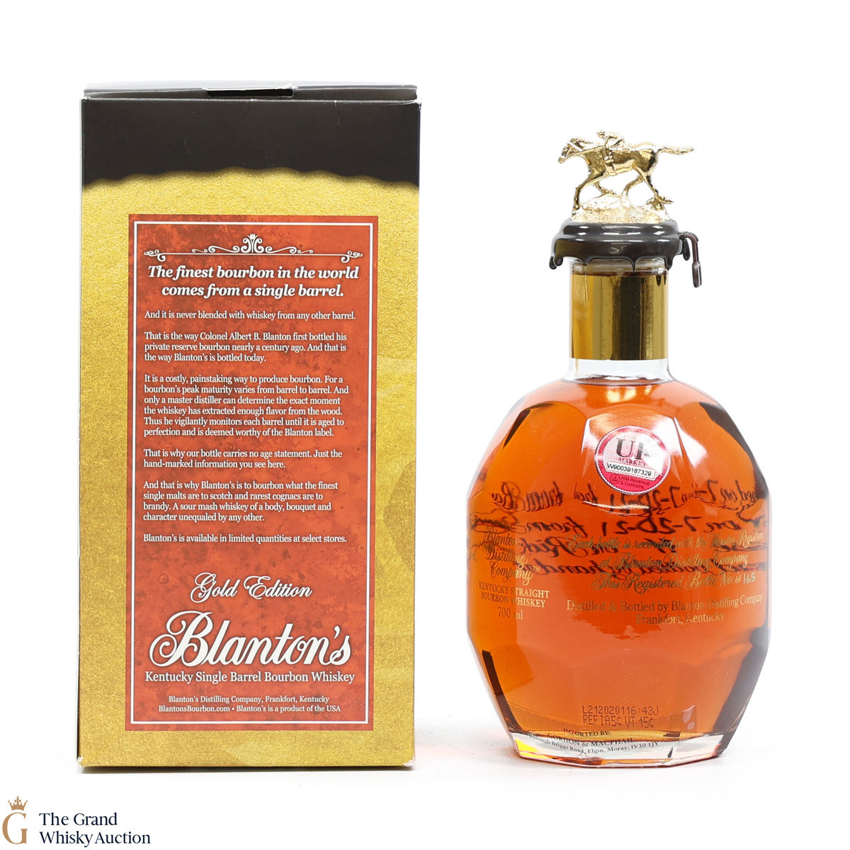 PLEASE NOTE: The wax seal on Blanton's bottles are prone to cracking in transit due to their design. Therefore, as stated in our T&C’s, we do not and will not accept liability should the seal be breached, broken, split or leak in transit. Additionally, please know due to the design of the internal cardboard packaging that surrounds the top of the bottles, it too may be torn. By bidding on this lot you have understood this to be true. Insurance is for complete breakage or loss in transit only.