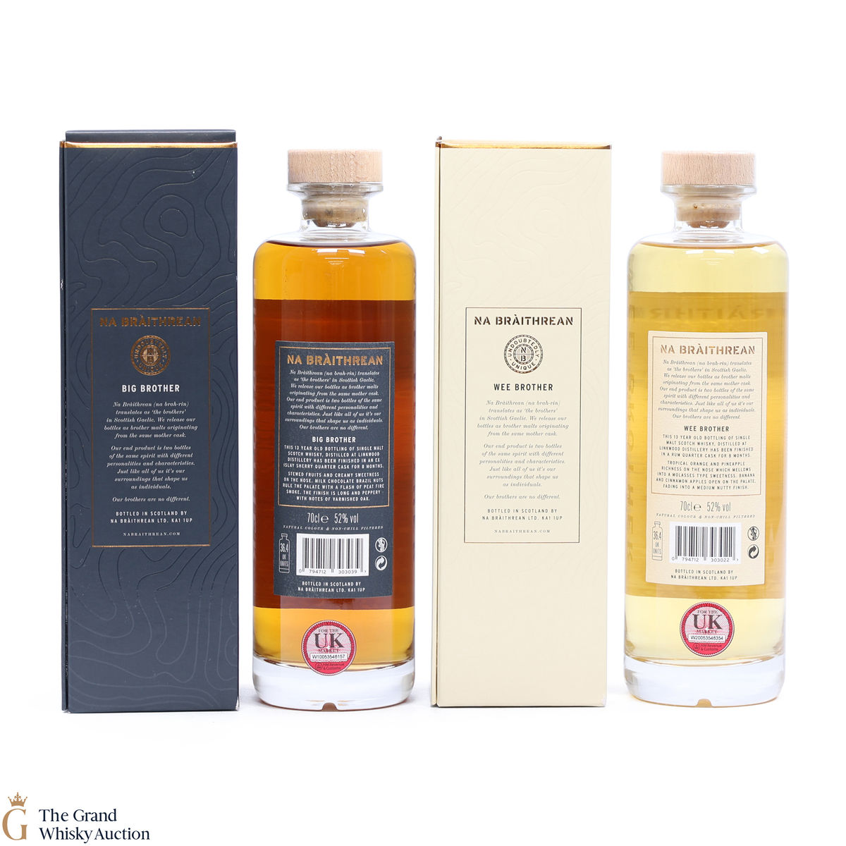A pair of Linkwood single malt Scotch whiskies, independently bottled by Na Bràithrean. The philosophy is that the whisky in a cask is split in two, and finishes it in two separate casks – the one that gets bottled first is the Big Brother, and the one that gets bottled second is the Wee Brother.