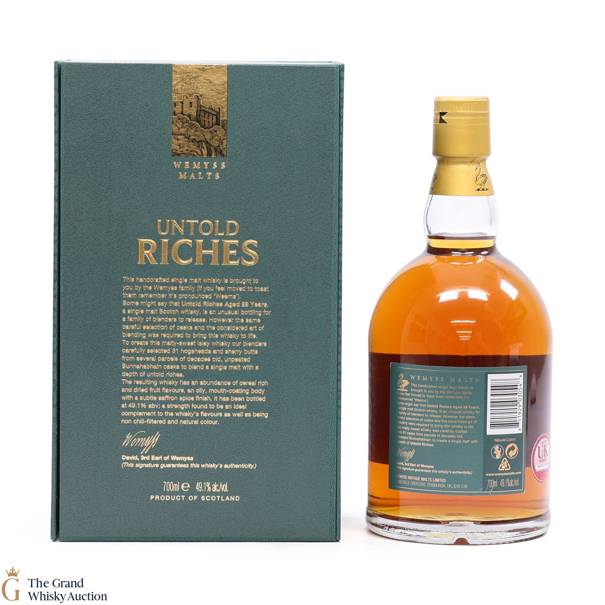 This handcrafted single malt is brought to you by the Wemyss family. Distilled at Bunnahabhain distillery, the Untold Riches 28-Year-Old is a single malt held in hogsheads and sherry butts from several parcels of decades-old, unpeated Bunnahabhain casks.