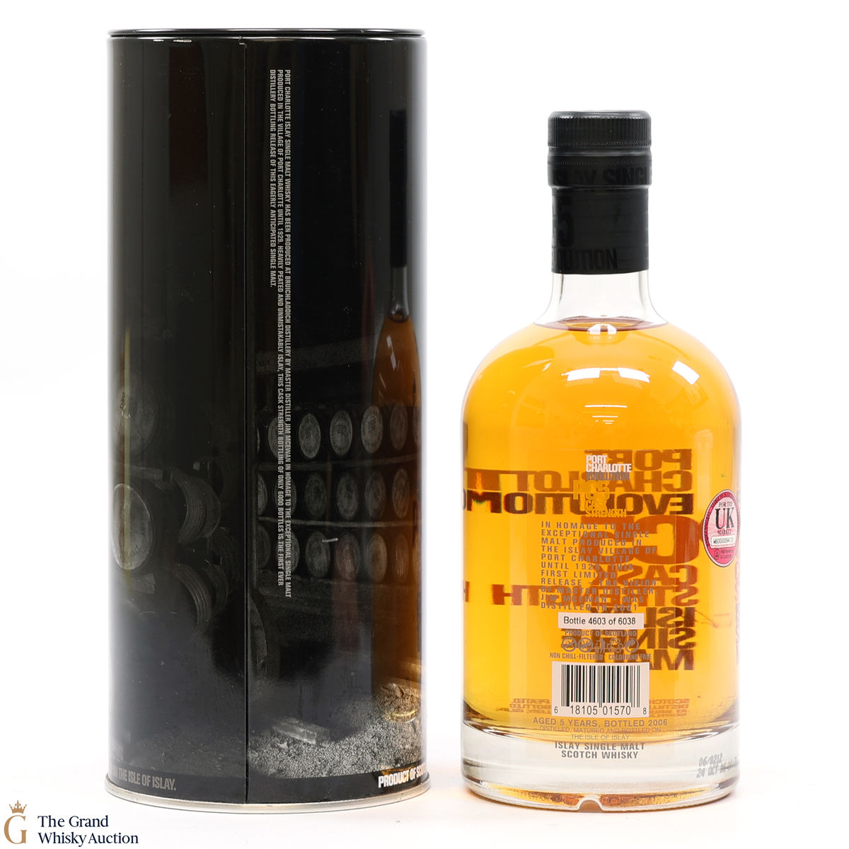 Port Charlotte PC5, produced by Bruichladdich Distillery, is a heavily peated spirit. It was the first release of heavily peated Port Charlotte and was produced in 2001 from some of the first spirits to be produced after the distillery's reopening. The single malt was bottled at 5 years old in 2006 and was limited to 6038 bottles.