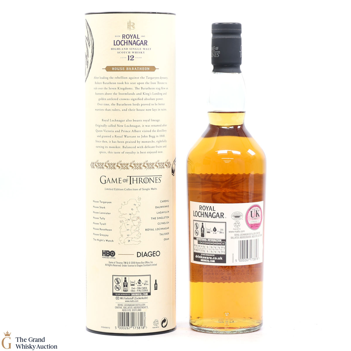 This is a limited-edition 12 year old single malt from Royal Lochnagar and it is part of Diagio's 2018 collaboration with HBO. Each single malt in the series relates to the land of houses of the Game of Thrones television series. The Royal Lochnagar bottle is decorated with a rampant black Stag, the sigil of House Baratheon that once flew on banners above the Stormlands and King’s Landing signifying absolute power.