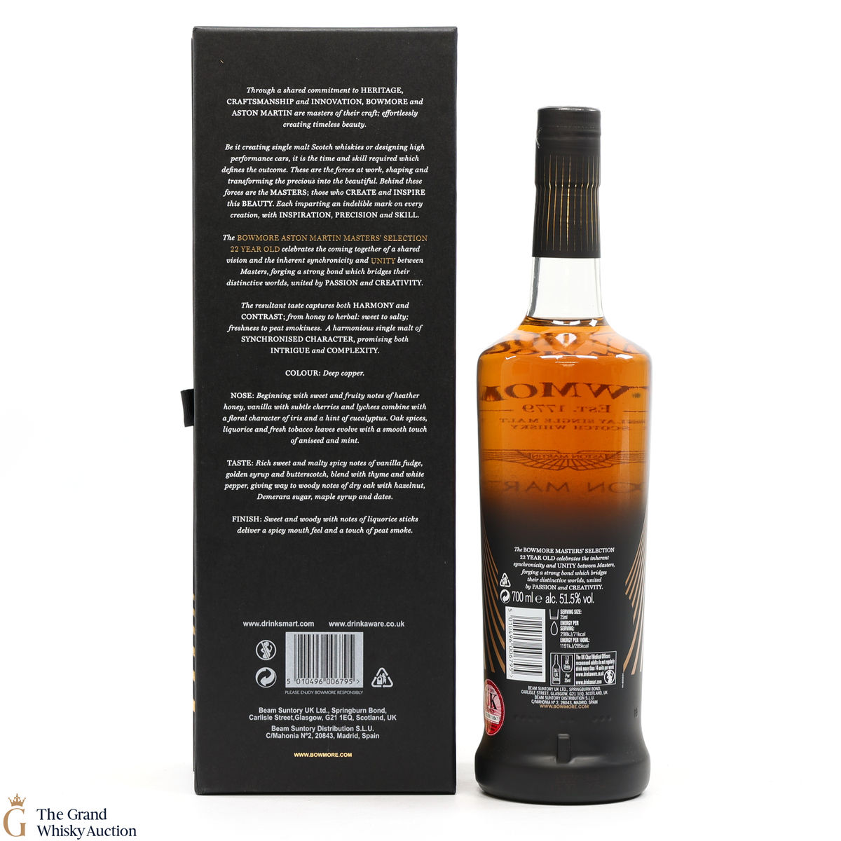 This 22-Year-Old Bowmore is a limited-edition single malt created in collaboration between Ron Welsh, Bowmore Master Blender, and Marek Reichman, Aston Martin Chief Creative Officer. Matured in a combination of American oak hogsheads and sherry butts. The result is a single malt that thrills all the senses for optimal enjoyment.