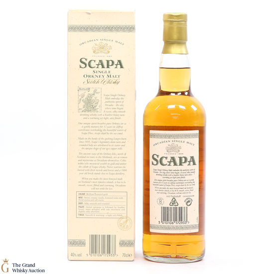 A long discontinued 12 Year Old from the Scapa Distillery in Orkney. It was matured for 12 years in clifftop warehouses overlooking the beautiful waters of the Scapa Flow.